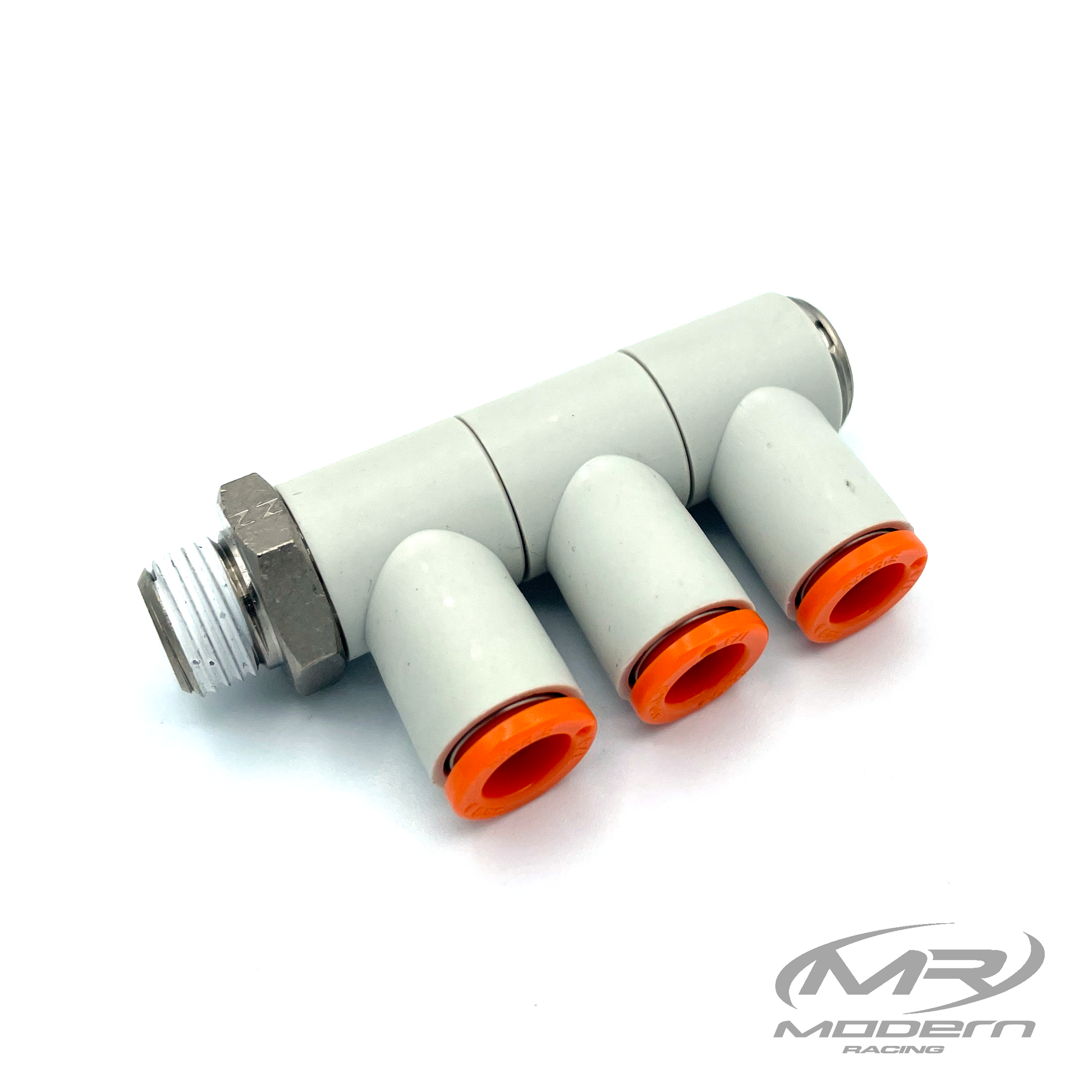 Hembra Push-Loc de 1/4" a macho NPT de 1/8" Conexión de aire giratoria de 3 salidas 90* Latón/plástico (niquelado)