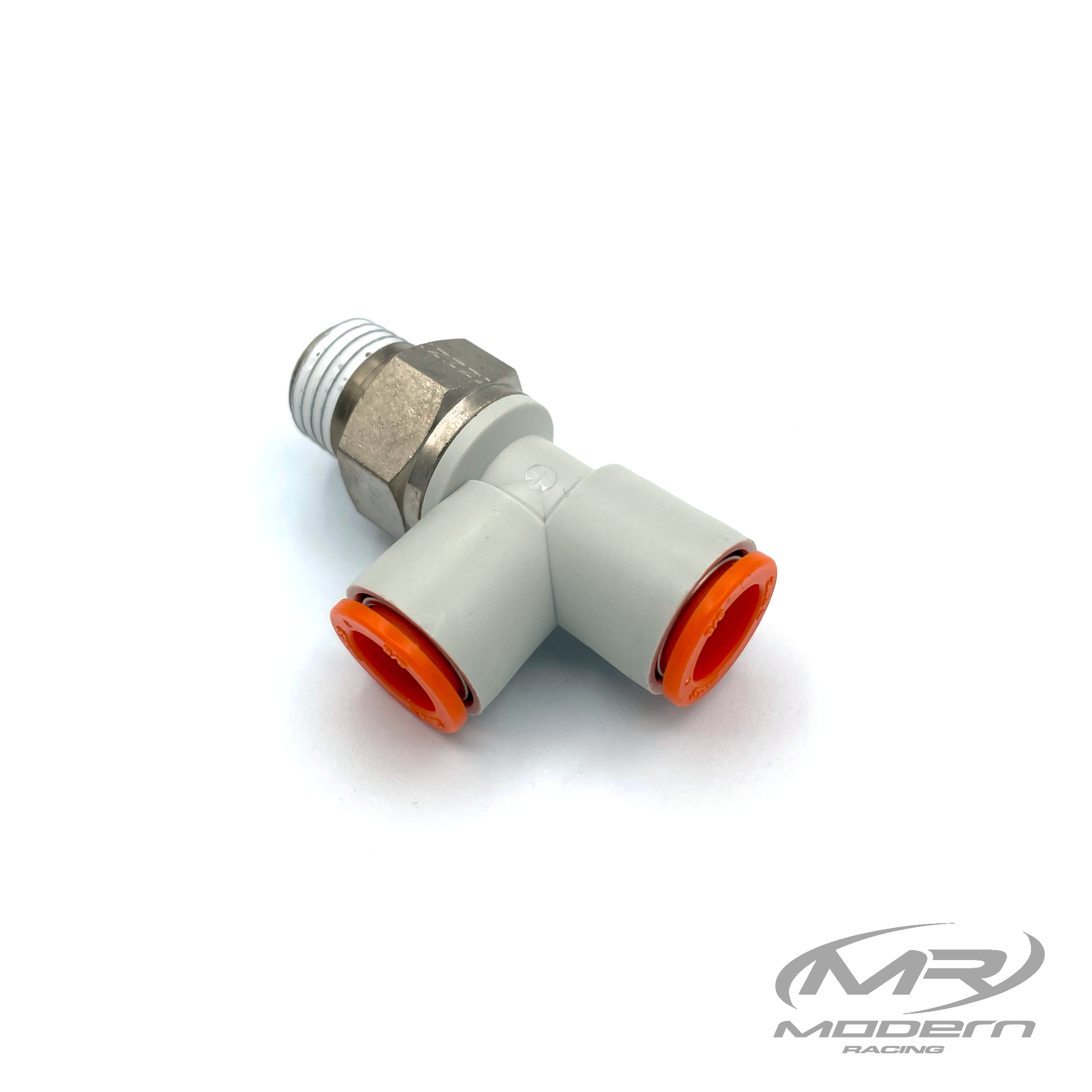 Conector de aire en T de ángulo recto macho de 3/8" Push-Loc hembra a 1/4" NPT latón/plástico (niquelado)