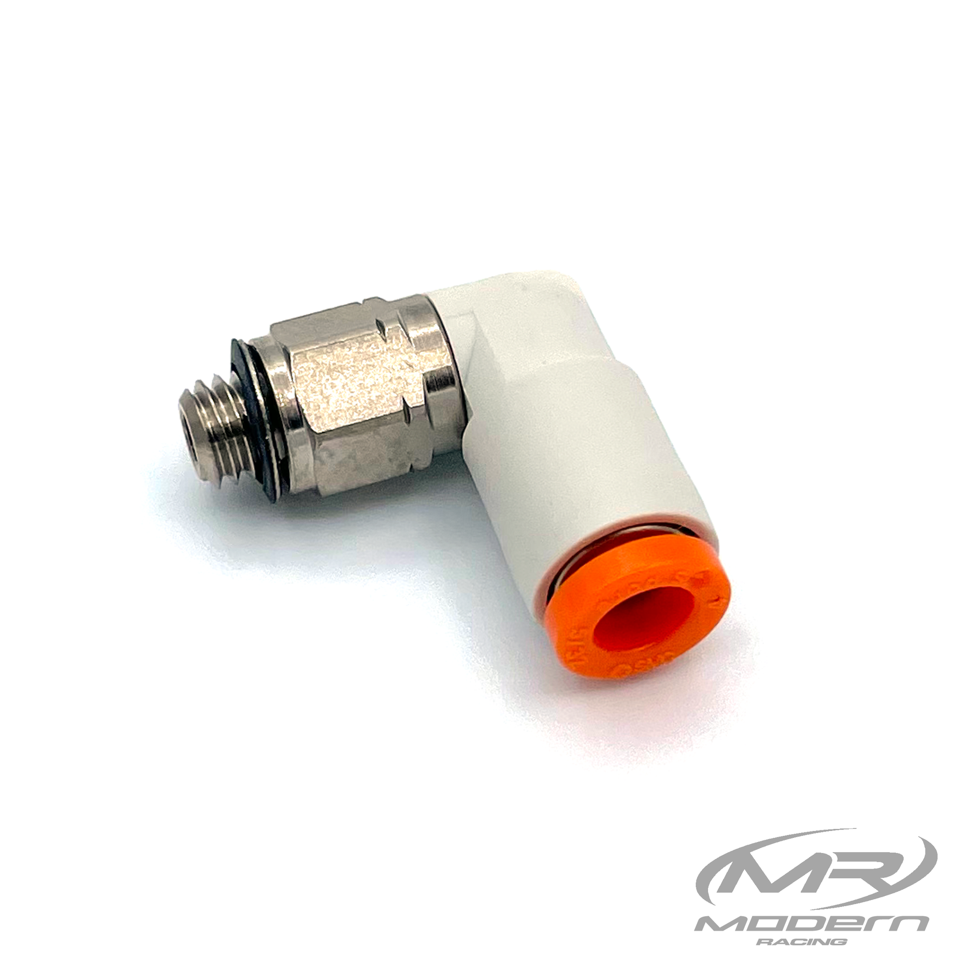 Conector de aire hembra Push-Loc de 5/32" a macho UNF de 10/32" 90* Latón/plástico (niquelado)