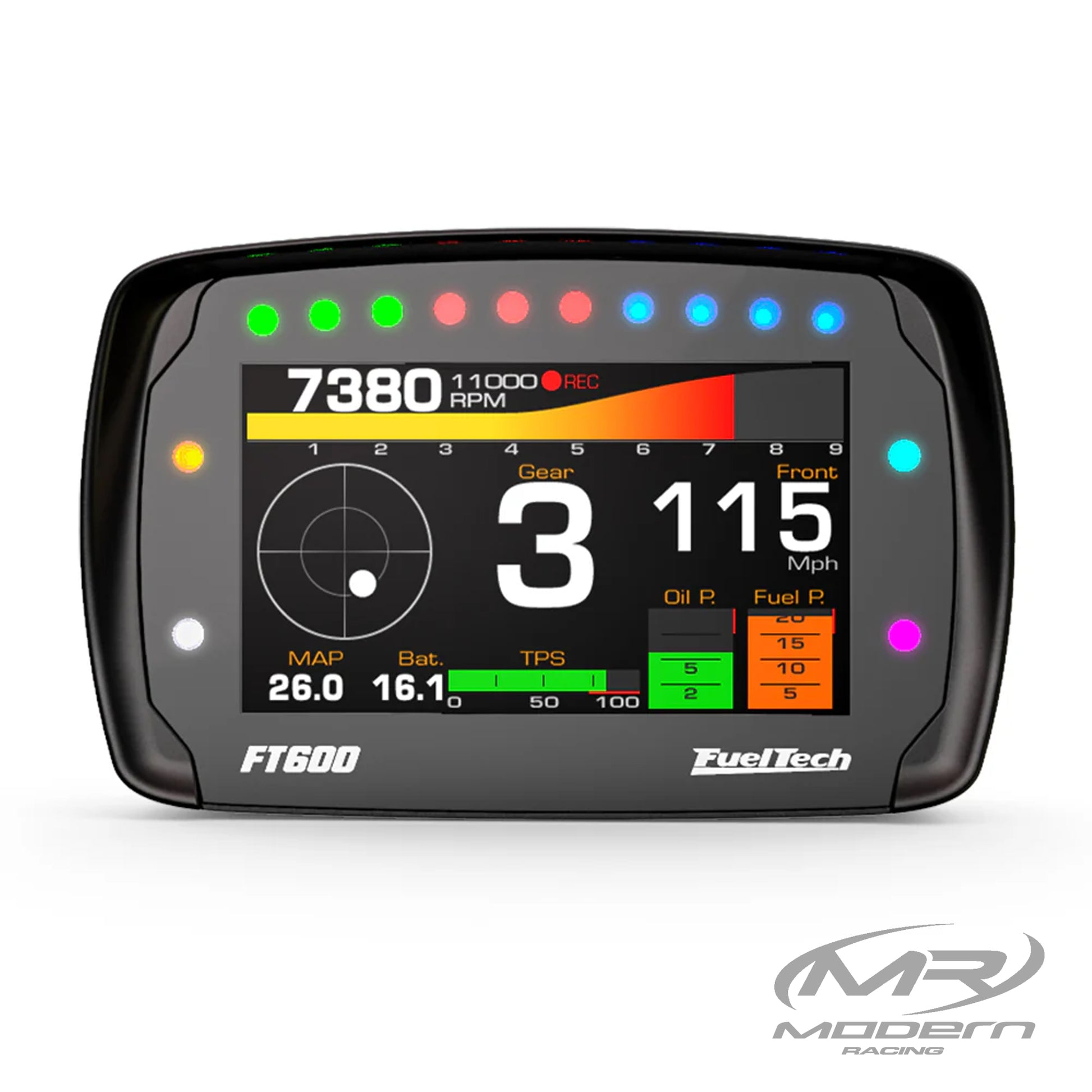 The FT600 ECU is our most advanced engine control and monitoring system. This top of the line ECU is capable of managing sequential injection and ignition on engines from 1 to 12 cylinders, or up to 4 rotors, and accommodates up to 20 inputs and 32 outputs. The FT600 offers the features and capabilities offered by the FT450 and FT550 models and more! Housed in an extremely durable aluminum case, the upgraded design also includes an upper visor to reduce glare and houses 10 LED lights with adjustable color and intensity, ideal for a progressive shift light. The 4 virtual LED lights on the FT450 and FT550 have been replaced with 4 adjustable LED lights, 2 on each side of the screen, that can be configured for alerts or to show the current status of any sensor. The 4.3” color touchscreen has been upgraded with an anti-glare display, integrated digital dashboard, 4 programmable display screens, and a customizable splash screen. The FT600 features dual 34 pin SuperSeal connectors, 2 CAN Bus ports, and USB-A mini. Equipped with FTManager software and an impressive list of features, including sequential injection and ignition, O2 closed loop, active traction control, integrated boost controller, internal datalogger, progressive and PRO-Nitrous controls, odometers, drag racing features, electronic throttle control, inclinometer gauge, integrated GearController with strain gauge sensor on the shifter for more efficient gear shift cuts, built-in accelerometer (G-meter), gyroscope, and more! IP67 rated for marine and off-road applications.