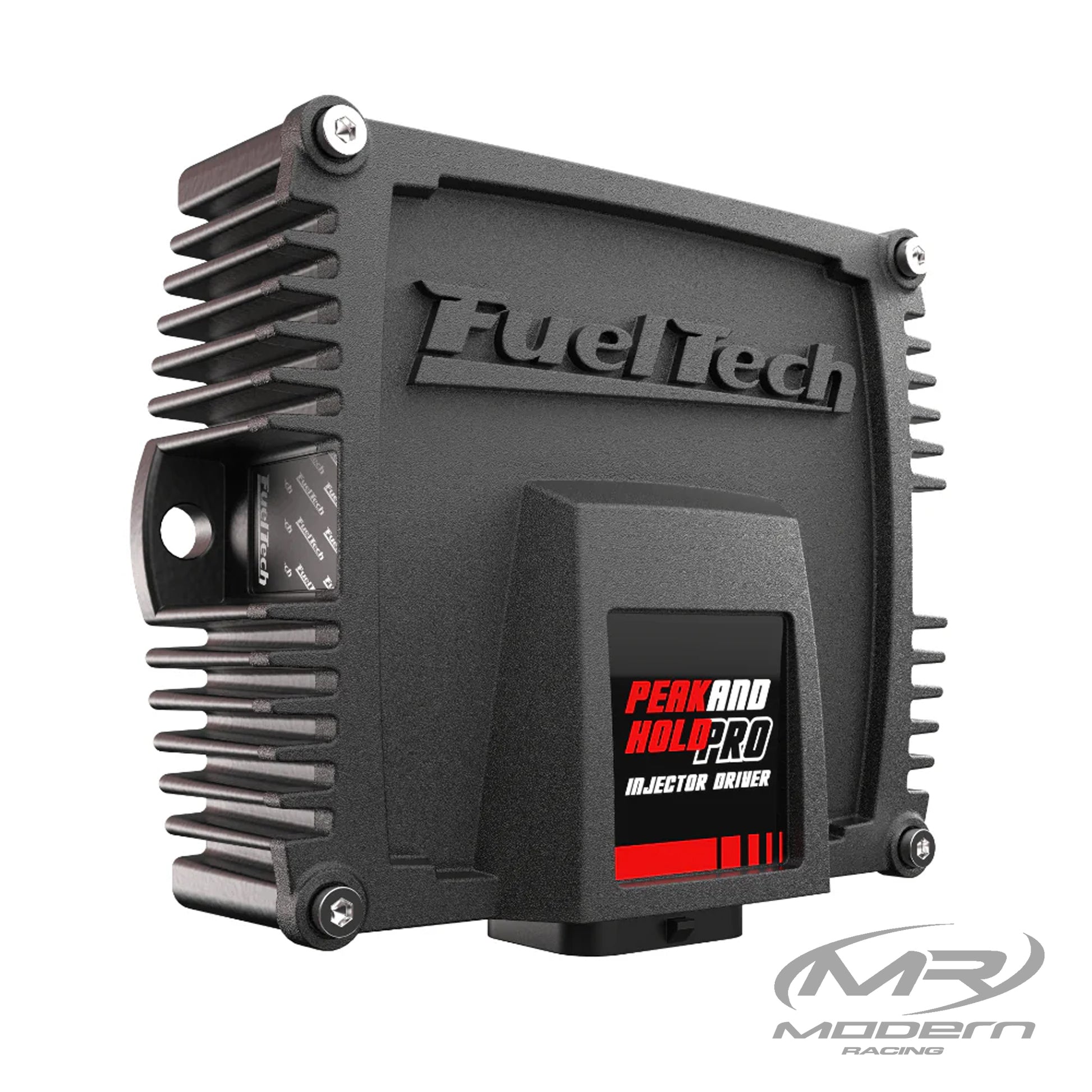 FuelTech’s Peak & Hold PRO Injector Driver is designed to control low impedance fuel injectors at a professional level, featuring 8 channels, 26-way automotive connector, and several integrated motor protections in case an injector or connection fails. It is capable of delivering 2 to 12 Amps of software-selected current per channel and has an internal temperature sensor, fault diagnosis, and protection against high temperature. The module is housed in an anodized aluminum and plastic case. Firmware updates available through CAN bus communication.
