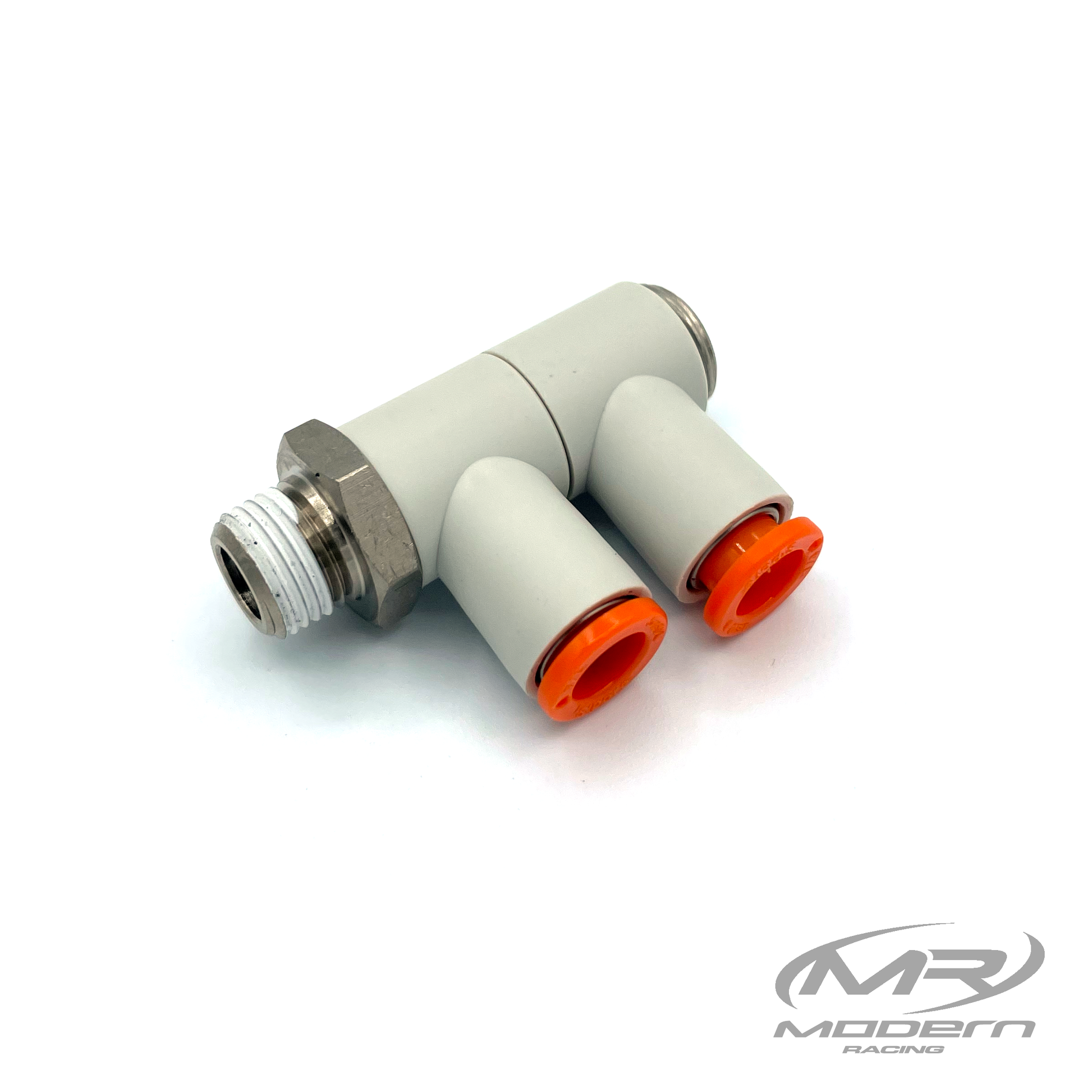 1/4" Push-Loc Female To 1/8" NPT Male 2-Outlet Swivel 90* Air Fitting Brass/Plastic (Nickel Plated). Full 360* rotation.
