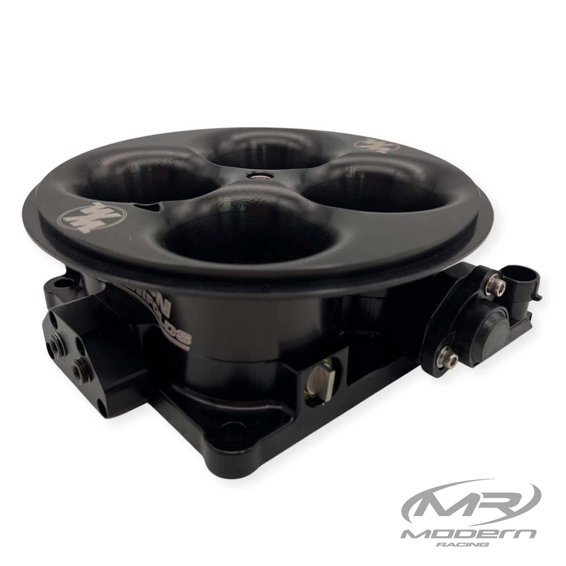 Wilson Manifolds High Flow Throttle Bodies were developed using the latest computer modeling software and test equipment available to produce designs that yield the maximum flow per square inch of cross-sectional area. This results in maximum power for any given throttle body type and size. Four barrel style throttle bodies are designed to work with our line of billet spacers and incorporate a tapered and radiused throttle bore and precisely machined progressive linkage for smooth throttle operation. They also feature inward opening throttle blades to eliminate any part throttle directional influence by the blades that can cause poor air distribution. We have also redesigned our Dominator style throttle bodies to incorporate improved throttle linkage and to significantly reduce overall mass. All throttle bodies feature stainless throttle blades to control vibration and reduce thermal expansion Throttle blades are fastened to the throttle shaft using aircraft quality hardware that is both Loctited and peened to assure positive retention of the blades. Throttle shafts are machined to decrease their cross-sectional area, which increases the actual cross-section available for airflow. All throttle bodies are machined from billet 6061-T6 aluminum on precision CNC machining centers for consistent quality and light weight. High flow throttle bodies are available in 4500 and 4150 four-barrel styles as well as many single bore sizes in Ford style.