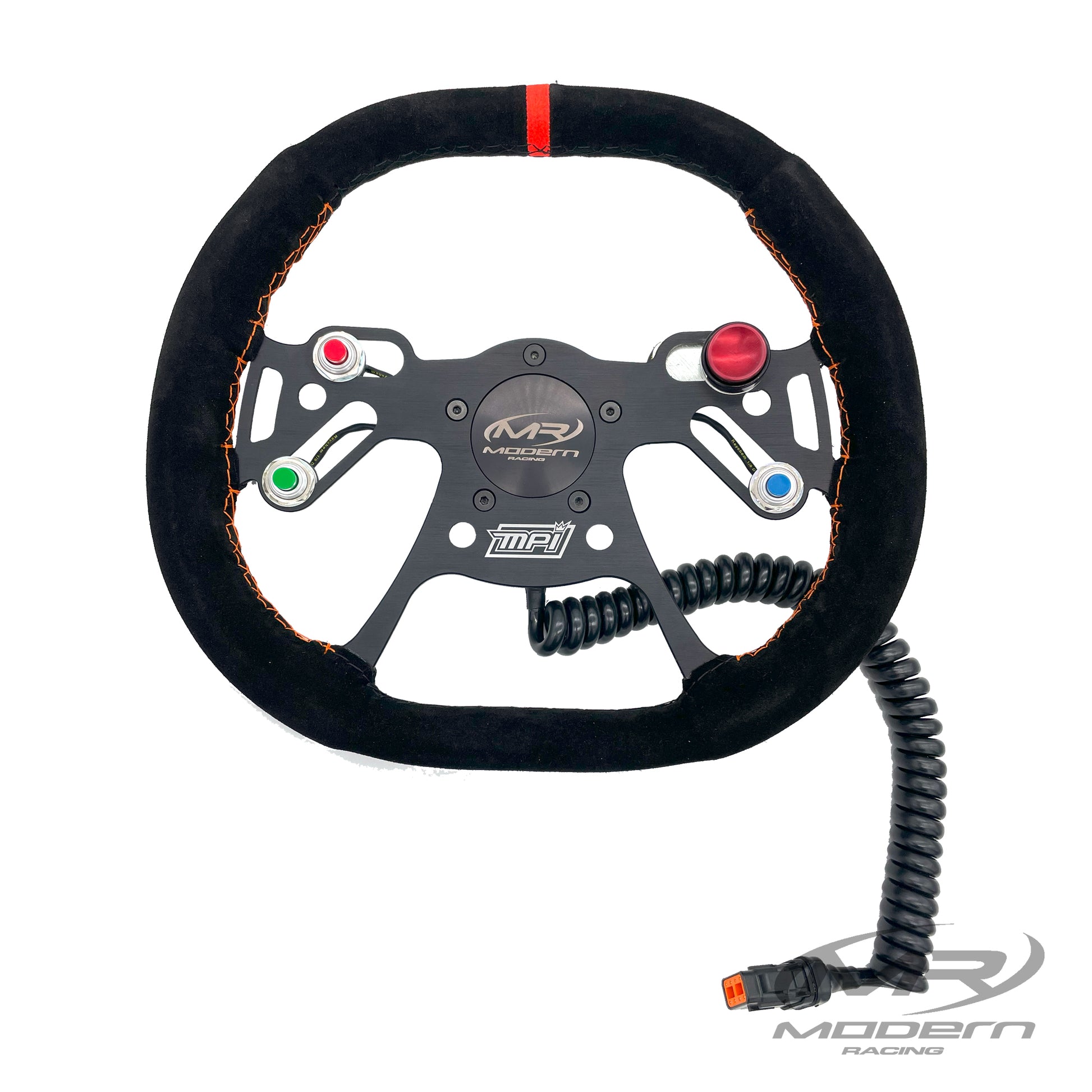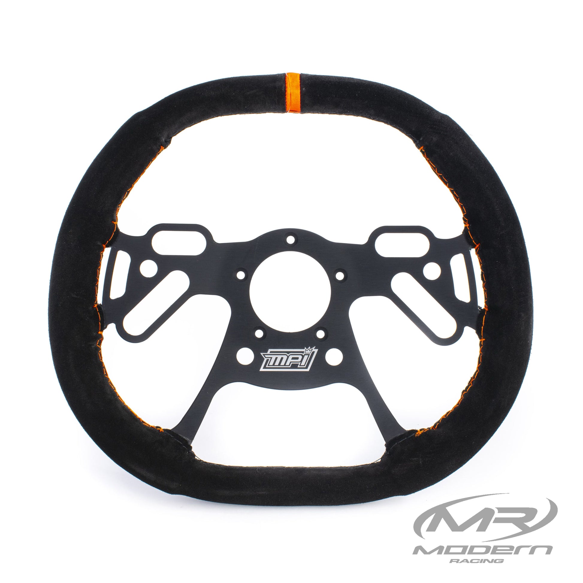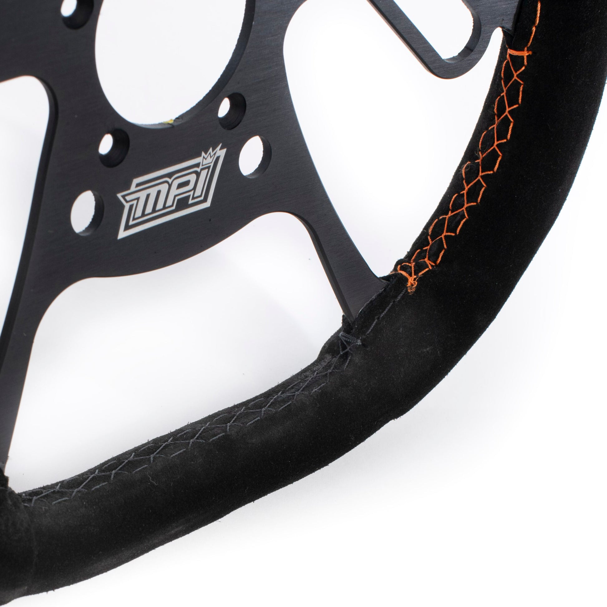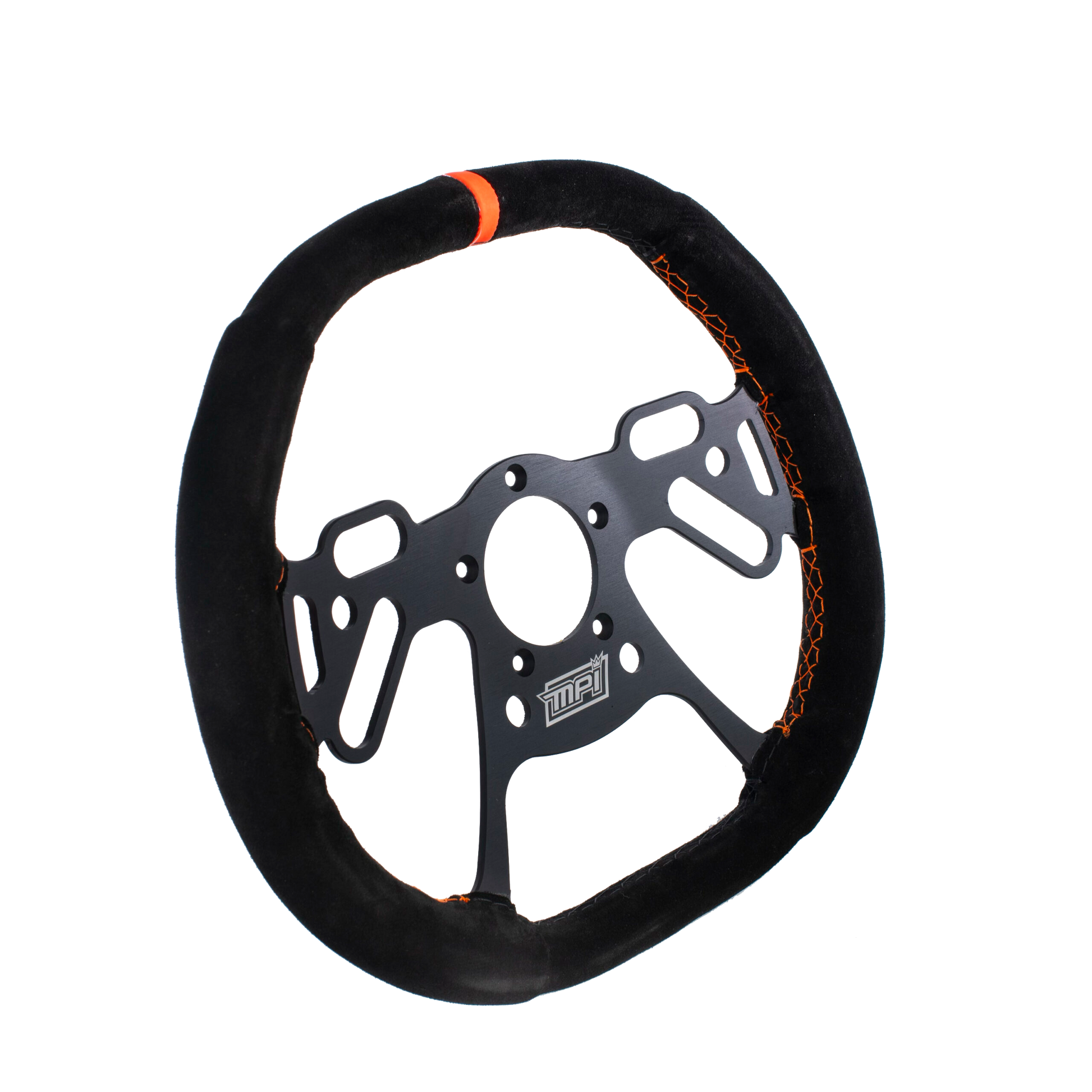 Three sizes are offered (10”, 12”, 13”) each with over 10 button locations, giving even the most demanding racers infinite adjustability. Each unit features: 4 small ½” holes, 2 small ½” x 1¼” slots, and 5 large 5/8” x 2” slots. The selected suede covering provides a high grip, natural feel, reducing the effort needed to hold the wheel while increasing driver feeling. The featured MPI Orange™ markers help both driver and crew chief have a visual reference of the steering wheel position. All models feature the standard drag racing 5 bolt pattern+ while the MPI-DRG-10 also includes 4 pilot holes for mini drag.