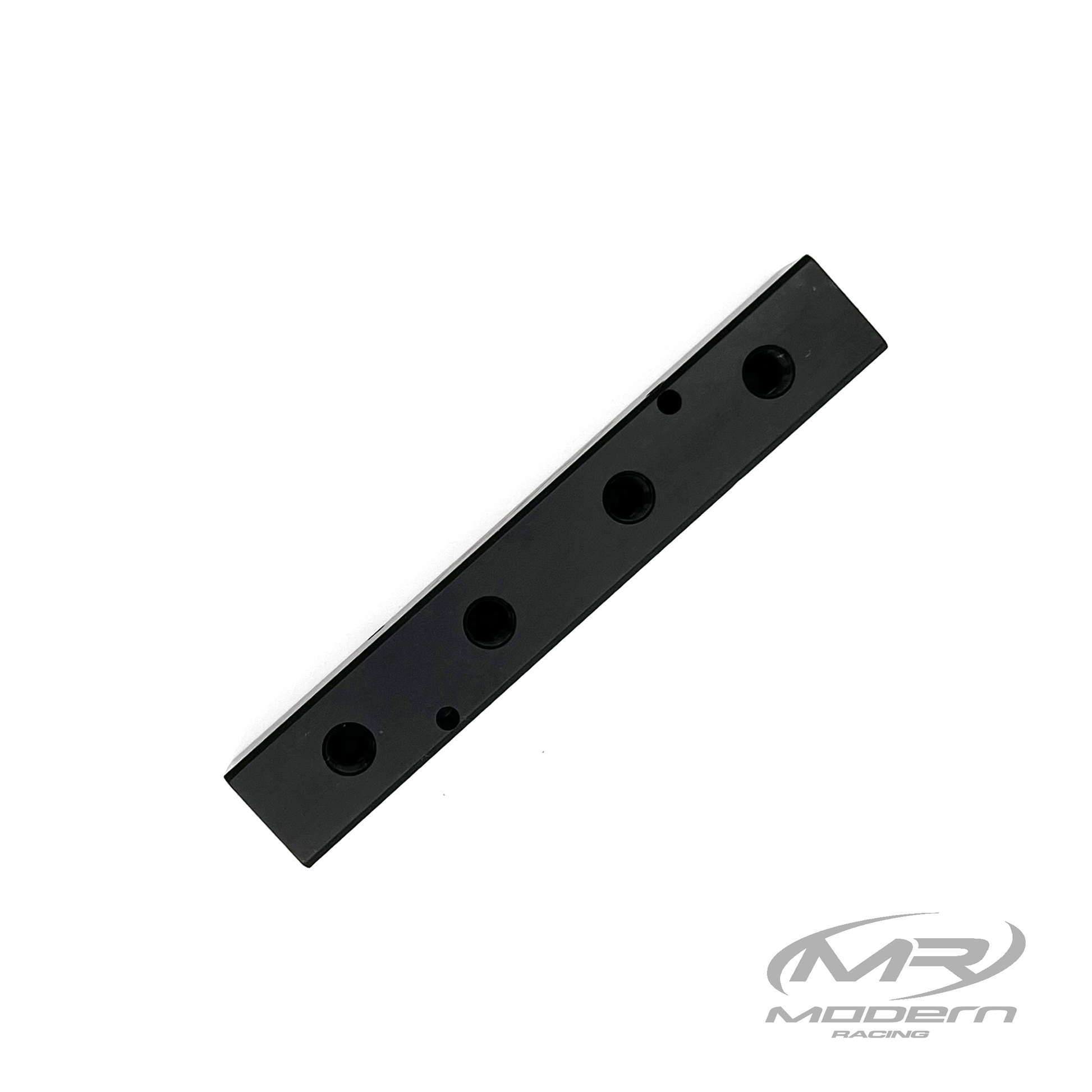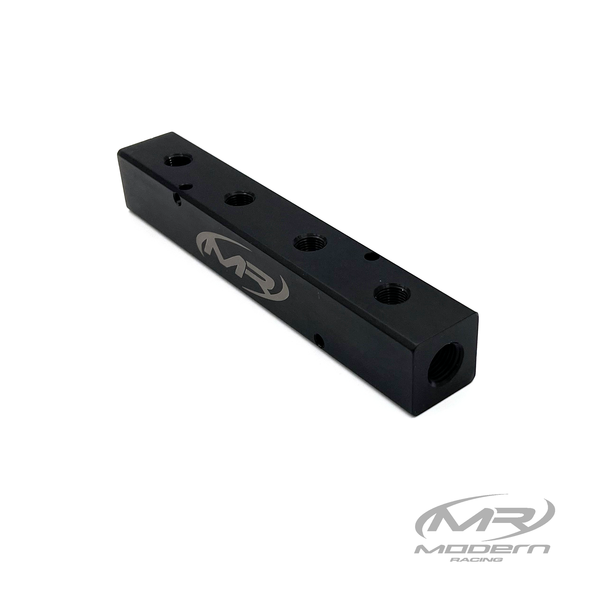 Aluminum air distribution block manifold, with 1/4" NPT inlet and 1/4" NPT outlet on ends and four 1/8" NPT ports on top.